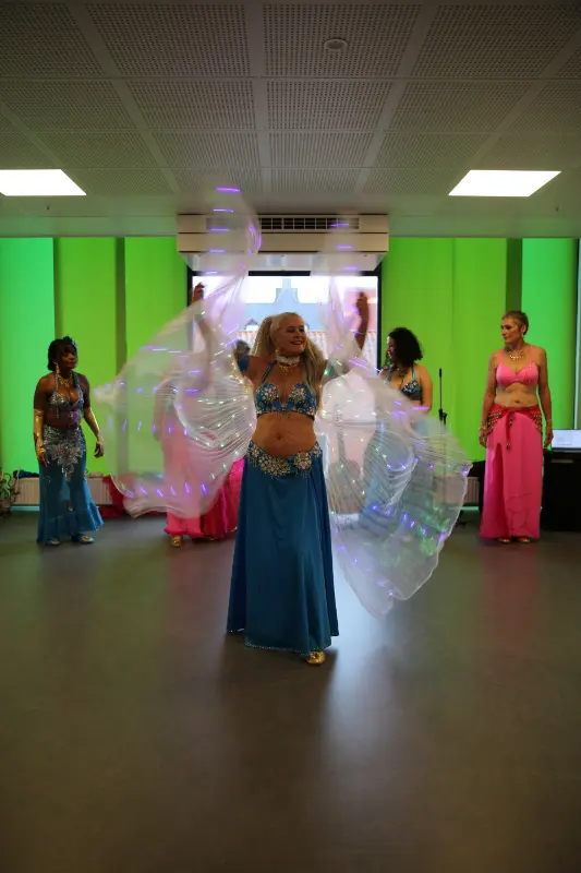 Lysende elementer: Aziza, Ida, Vera, Fahrida og Queenie brugte både Isis-wings, lysende stokke og slør med lys i koreografierne.