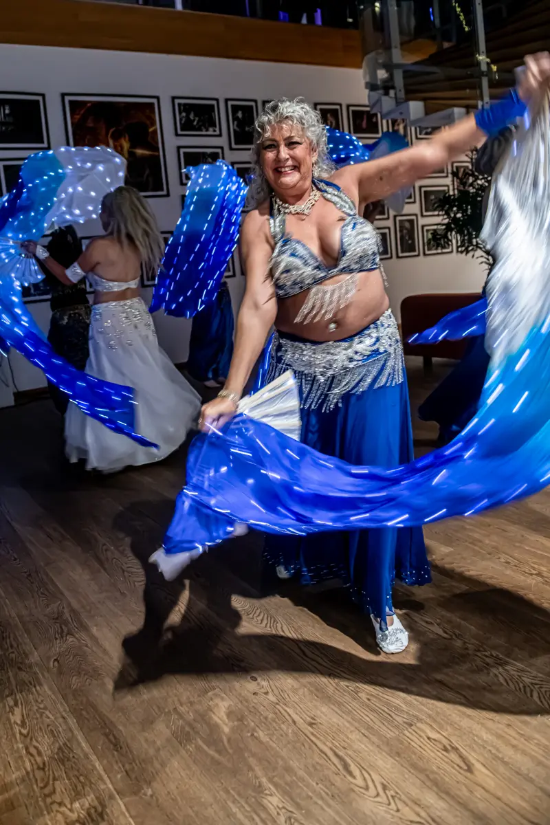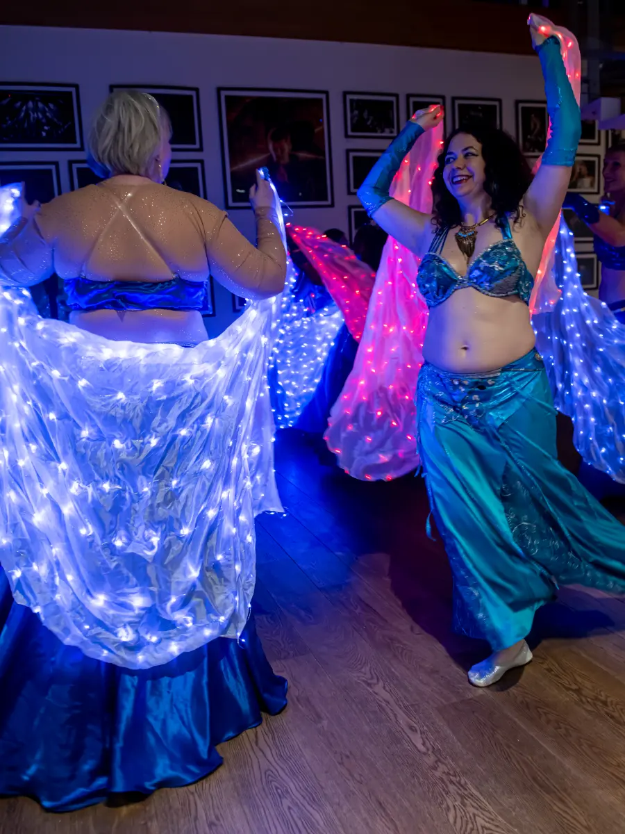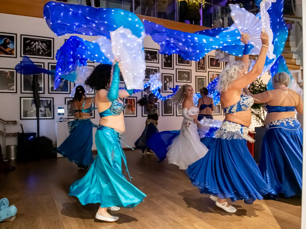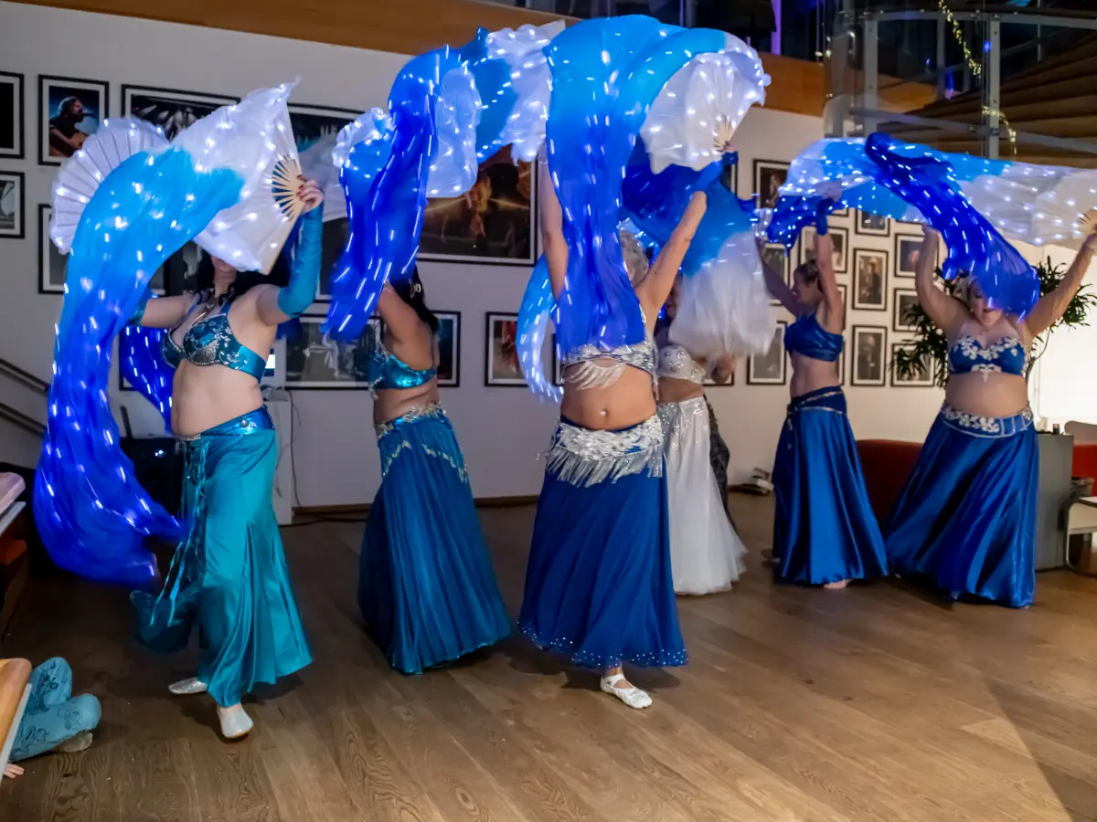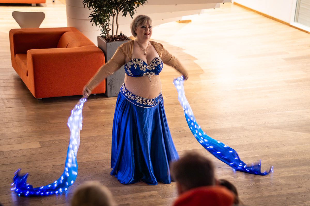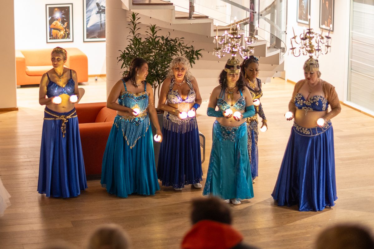 Gruppen bevægede sig gennem både klassiske orientalske udtryk og mere moderne, lysbårne variationer. De farvegraduerede silke‑vifteslør, de lysende dansestokke og de glimtende shamadan‑kroner skabte et farverigt univers, hvor hver dans fik sit eget udtryk. Publikum fulgte dansen på få meters afstand, og den tætte kontakt gjorde oplevelsen både personlig og levende.