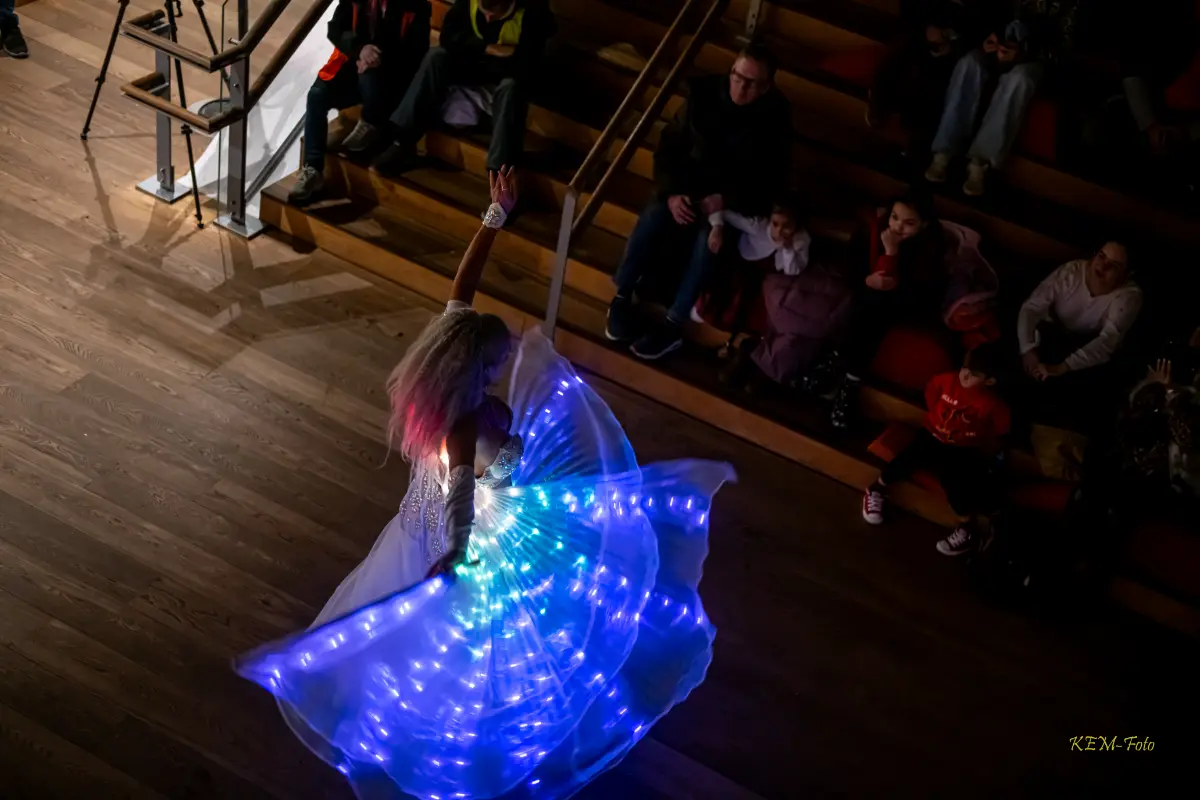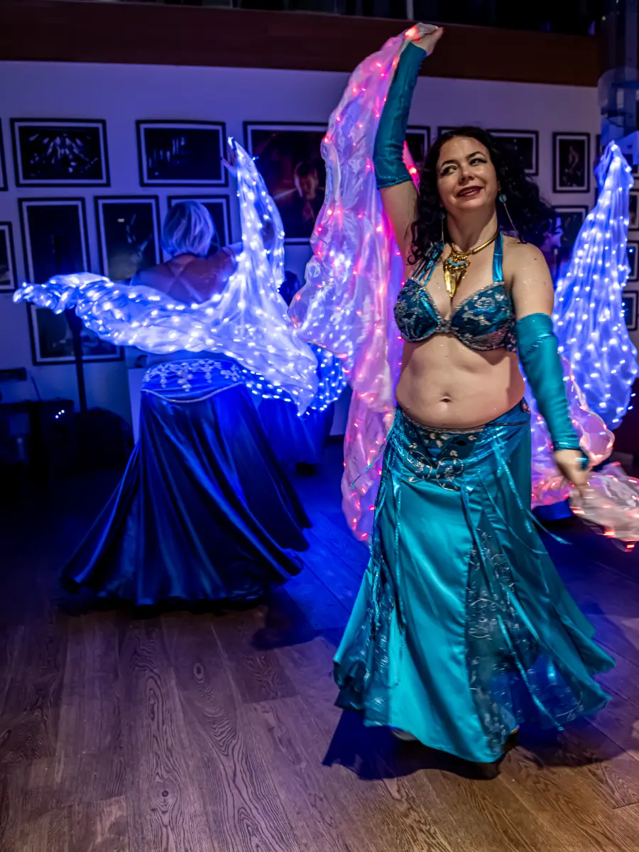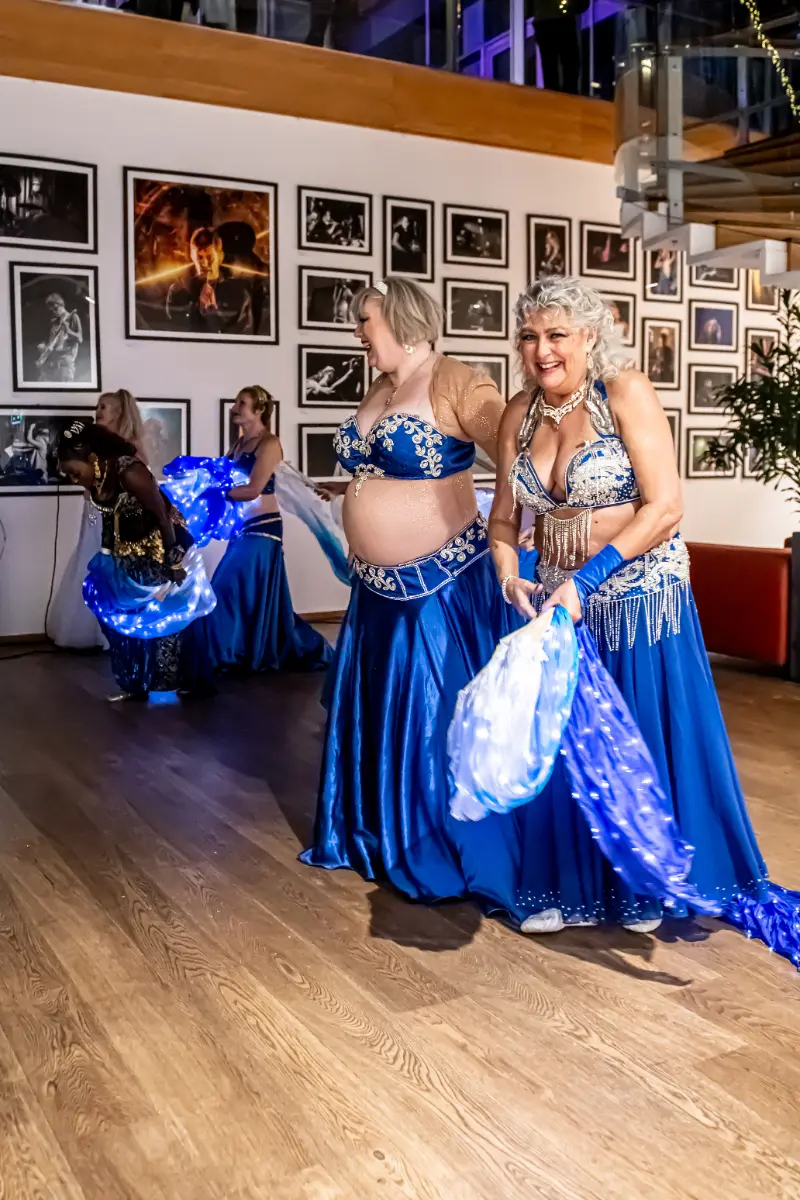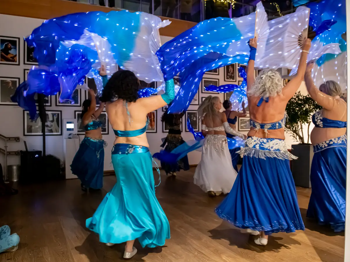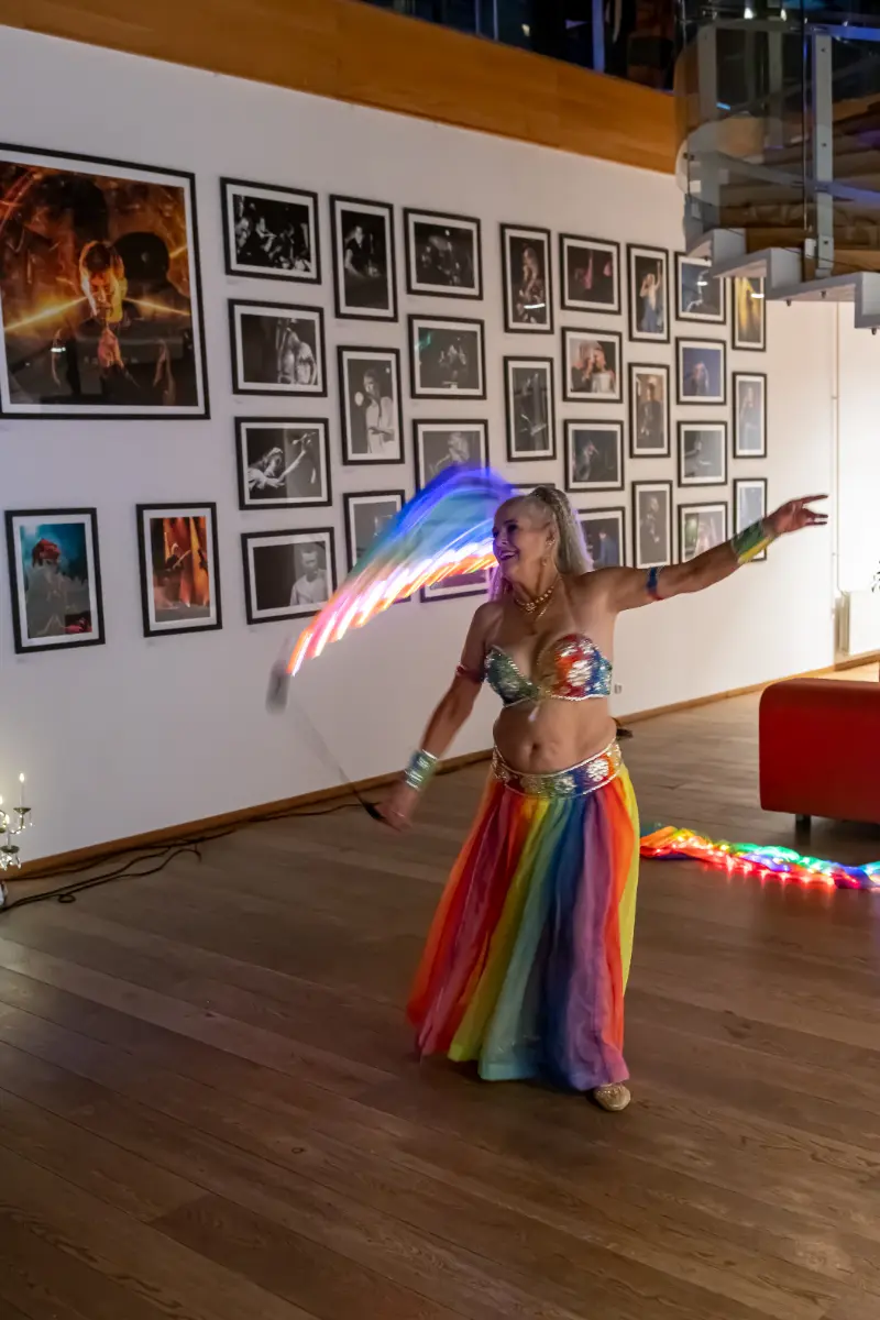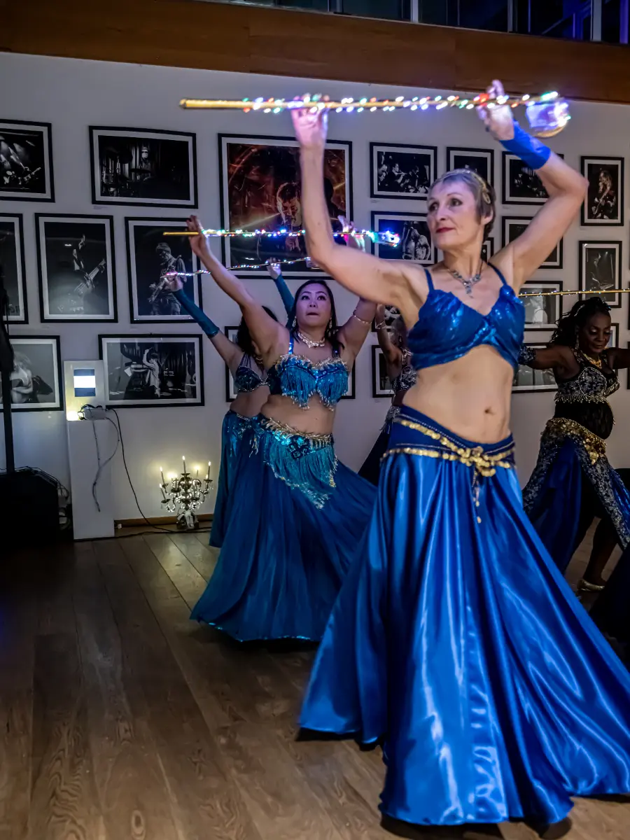 Gruppen bevægede sig gennem både klassiske orientalske udtryk og mere moderne, lysbårne variationer. De farvegraduerede silke‑vifteslør, de lysende dansestokke og de glimtende shamadan‑kroner skabte et farverigt univers, hvor hver dans fik sit eget udtryk. Publikum fulgte dansen på få meters afstand, og den tætte kontakt gjorde oplevelsen både personlig og levende.