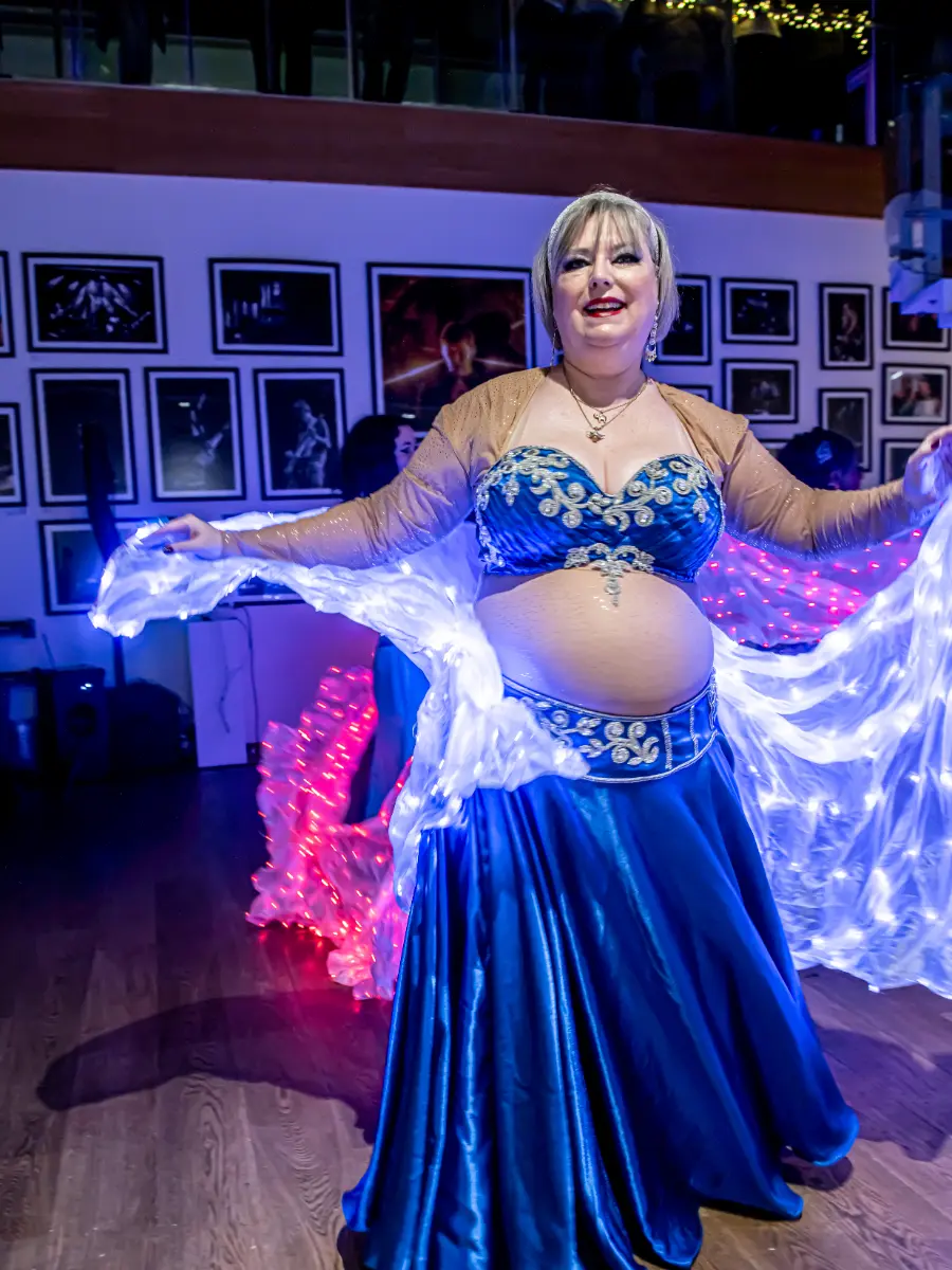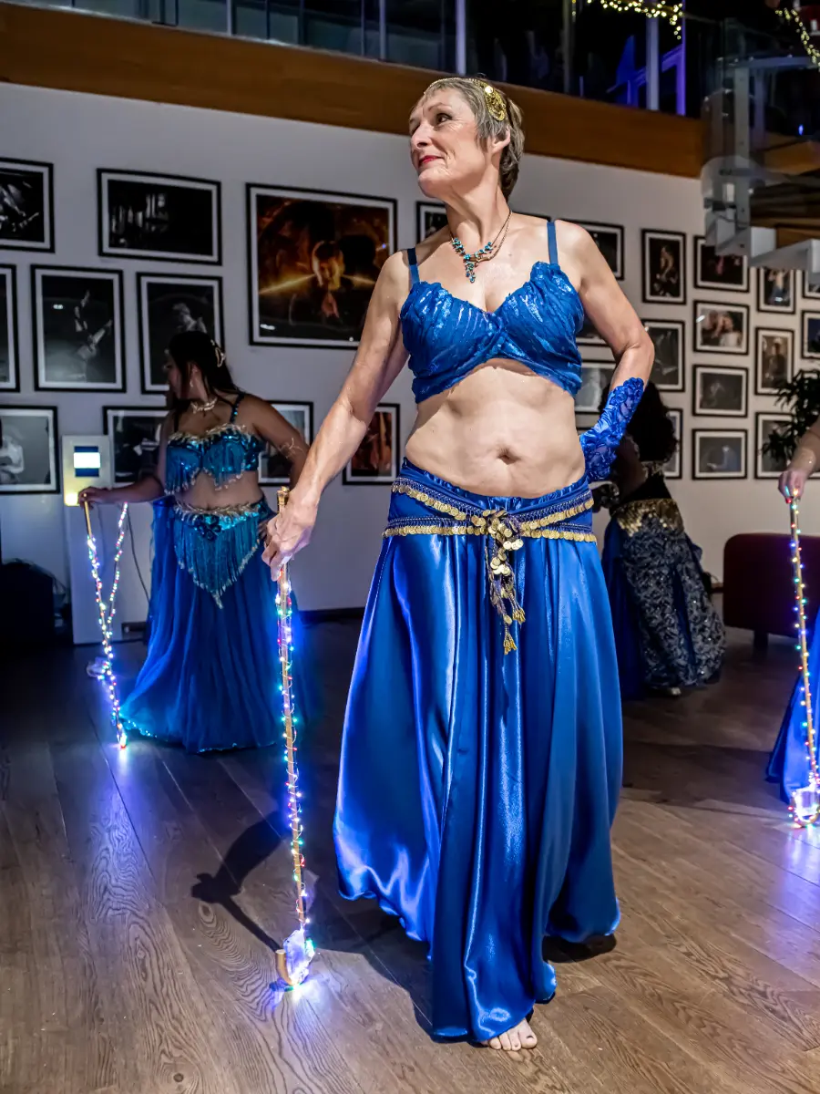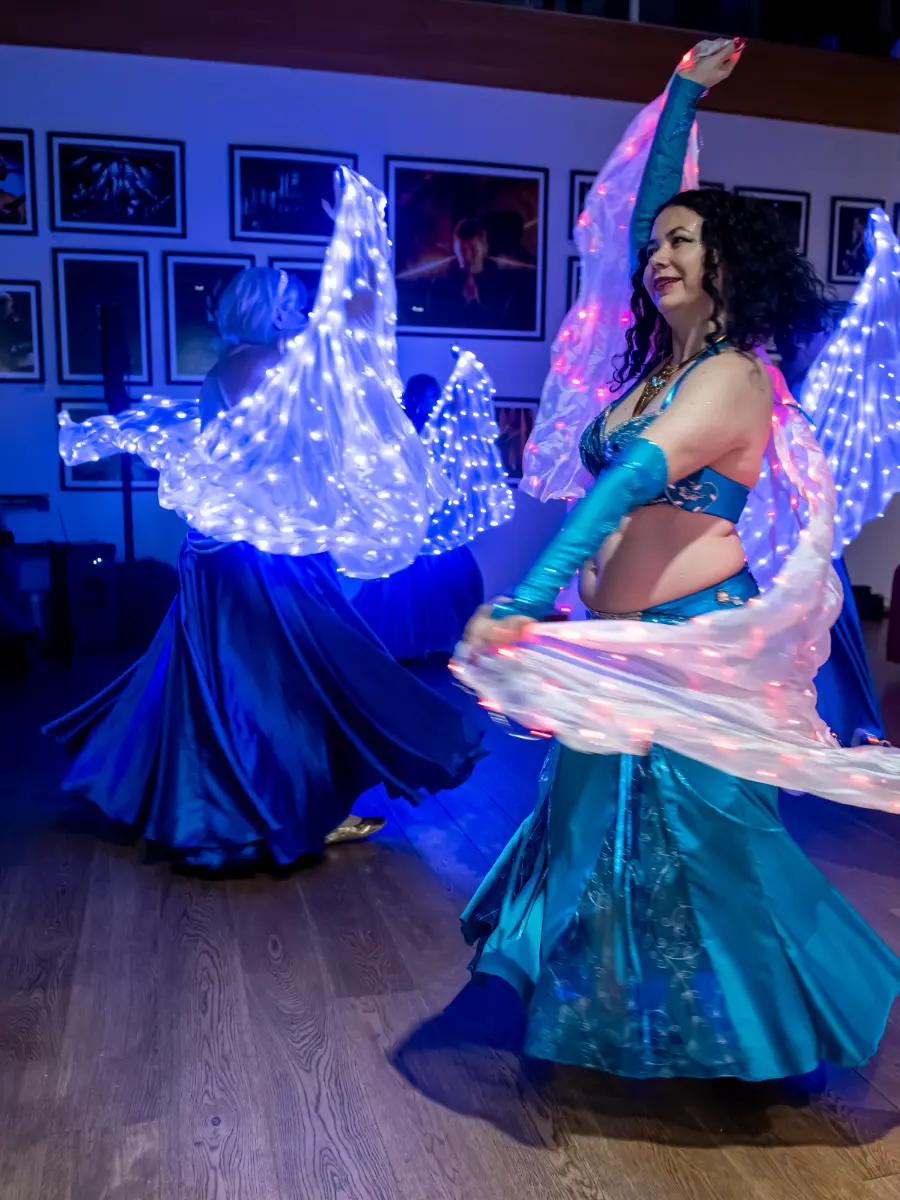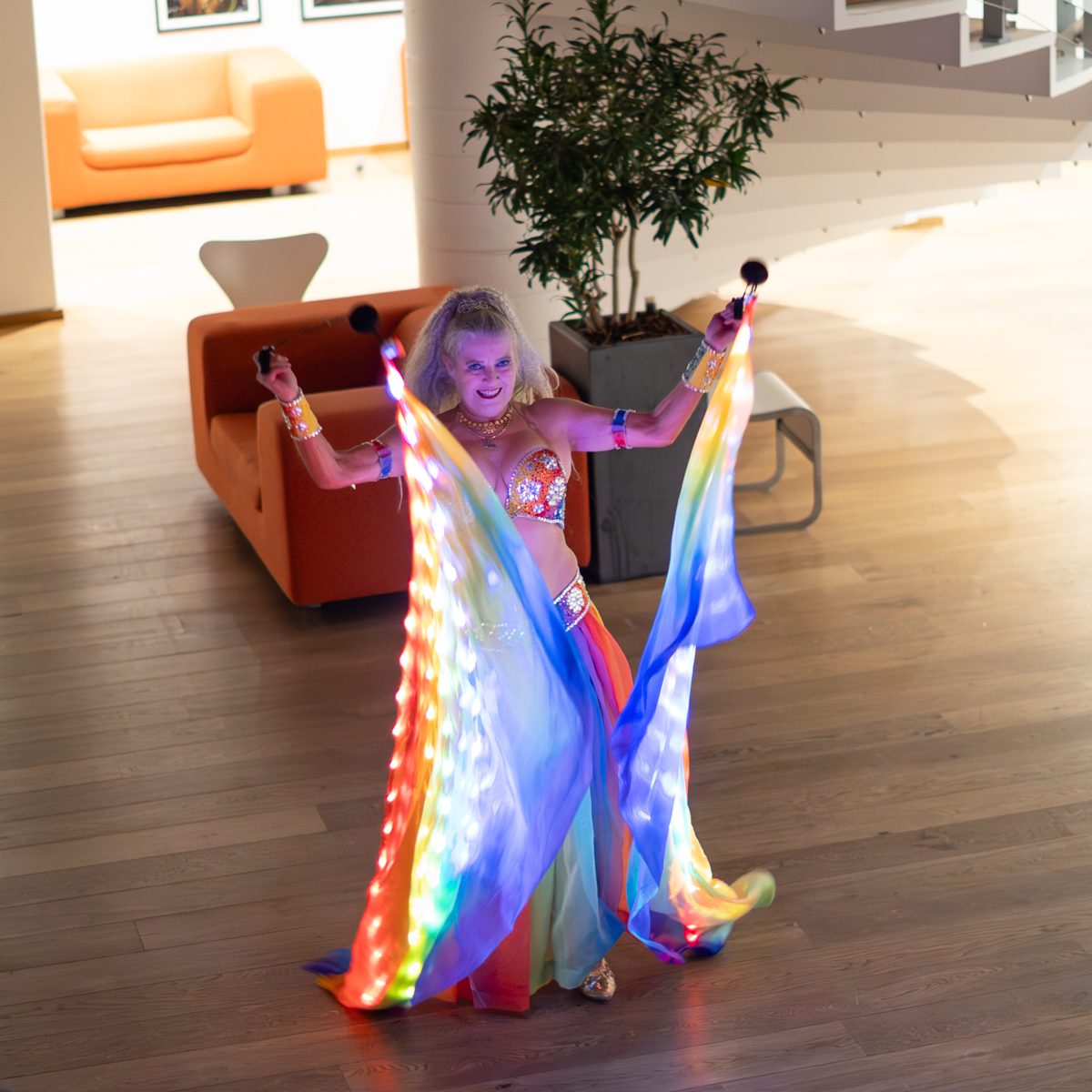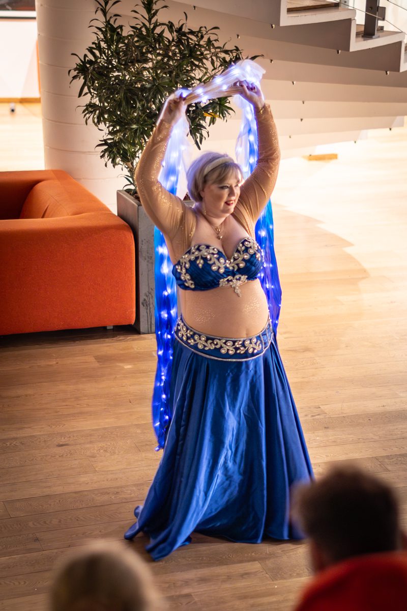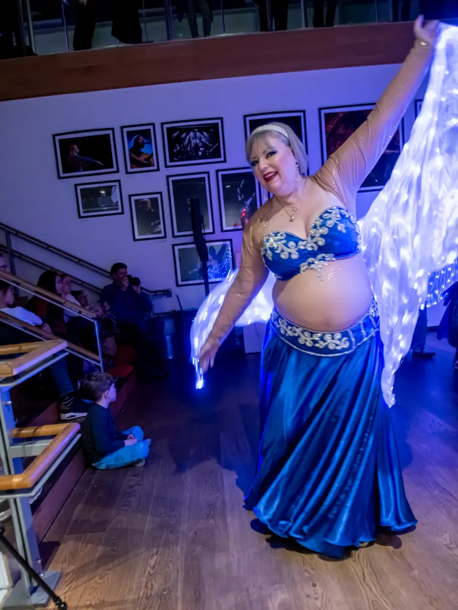 Gruppen bevægede sig gennem både klassiske orientalske udtryk og mere moderne, lysbårne variationer. De farvegraduerede silke‑vifteslør, de lysende dansestokke og de glimtende shamadan‑kroner skabte et farverigt univers, hvor hver dans fik sit eget udtryk. Publikum fulgte dansen på få meters afstand, og den tætte kontakt gjorde oplevelsen både personlig og levende.