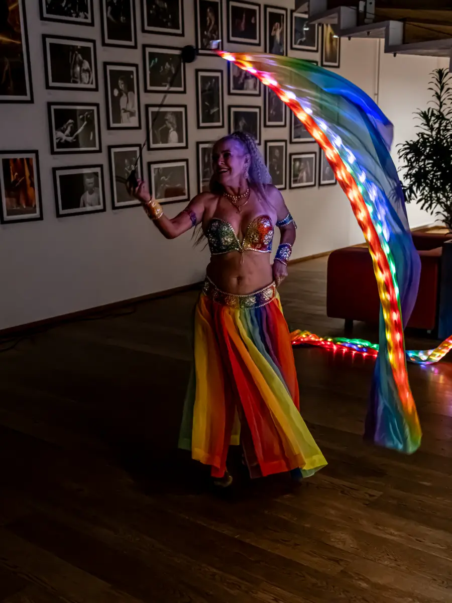 Aftenen bød også på to solodansere, der hver især satte deres præg på stemningen. Publikum så, hvordan Aziza lod sine lysende Isis‑wings folde sig ud som glødende vinger i rummet, og senere på aftenen skiftede Aziza til et regnbuefarvet kostume og pois‑slør, der hvirvlede omkring hende som levende farvespor.
