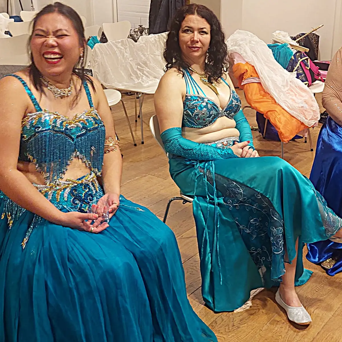Bag scenen udspillede der sig en helt anden stemning end den farverige energi i rummet. Her arbejdede danserne koncentreret og hjalp hinanden med de sidste detaljer: makeup, øjenvipper, udretning af slør og fastgørelse af sikkerhedsnåle. Fællesskabet var tydeligt og bar præg af både fokus og omsorg — et stille forarbejde, der stod i skarp kontrast til den lysende optræden få minutter senere.